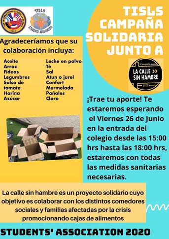 «TISLS Solidario es una campaña junto a Calle Sin Hambre que tiene como propósito entregar cajas con donaciones a familias en sectores vulnerables durante esta situación tan límite. ¡Agradecemos infinitamente su colaboración! Cada aporte hace una gran diferencia. ¡Los esperamos el Viernes 26 de Junio, entre las 15:00 hrs y 18:00 hrs en el colegio!»